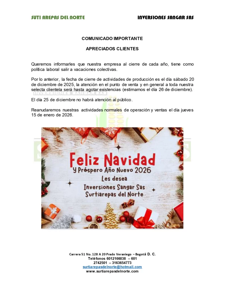 Descubre el autentico sabor de Colombia y Bogotá en nuestra Fábrica de arepas. En SurtiArepas del Norte nos enorgullecemos de ofrecer las más deliciosas y frescas arepas de maíz 100% peto, perfectas para cualquier momento del día. Desde las tradicionales arepas blancas hasta nuestras innovadoras arepas rellenas de queso, cada bocado esta lleno de sabor y tradición. Visítanos y vive una experiencia única, donde la calidad y el sabor casero se encuentran para crear las mejores arepas de la ciudad.